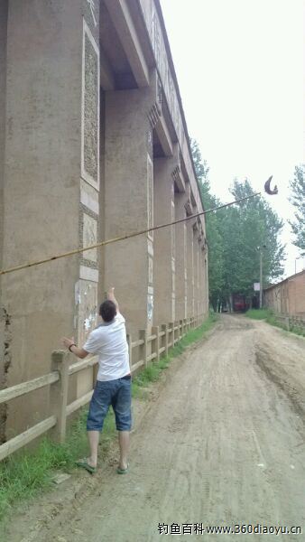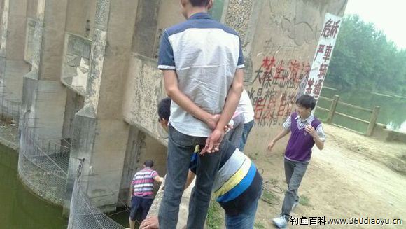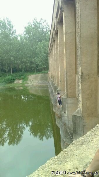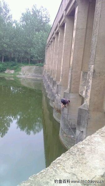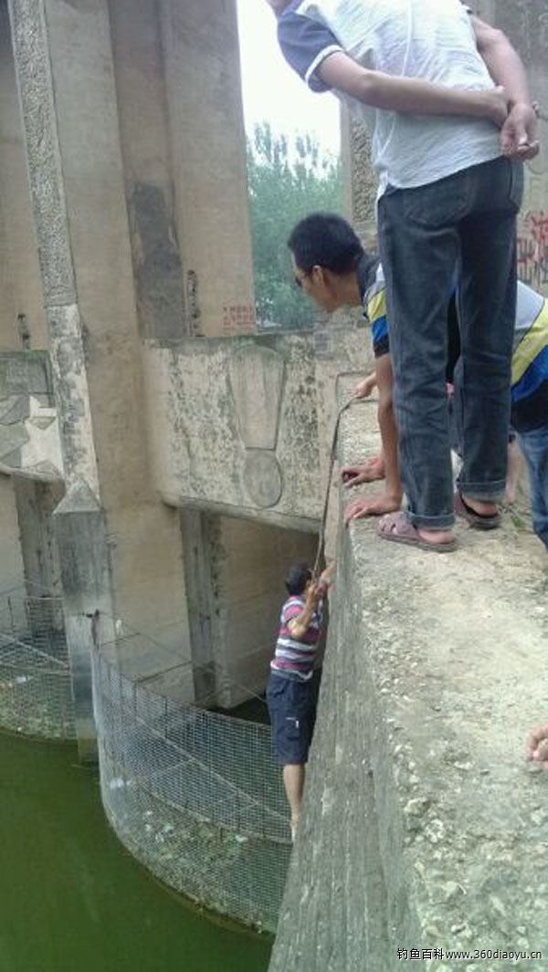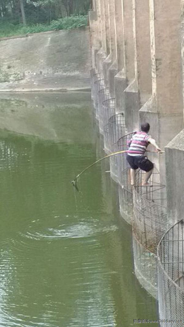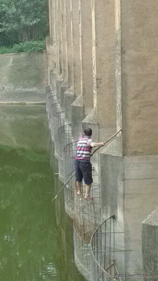 已经成功下到了桥墩,为了一条鱼,要是脚一滑,掉水里了怎么办?不得不佩服要鱼不要命的胆量和勇气。